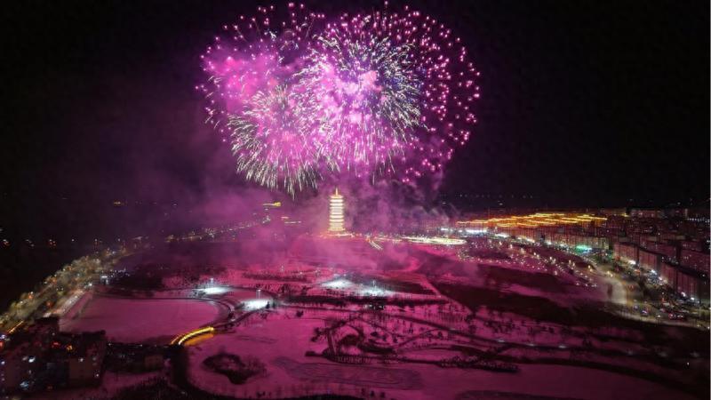 烟花燃放活动分为喜迎新年·福润鹤岗、七彩祥云·瑞罩兴安、盛景华章·情满煤城、展望未来·奋进鹤岗四个篇章。伴随着一声声震彻长空的礼炮响,第一簇金色焰火腾空而起,在夜空中绽放出耀眼光芒,高空礼花次第升空、竞相绽放,红牡丹、七彩祥云、锦冠瀑布等造型轮番登场。璀璨焰火与平安塔、城市楼宇灯光相映成趣,勾勒出鹤岗夜色的灵动与壮美,将元宵之夜的浪漫与热烈推向高潮。